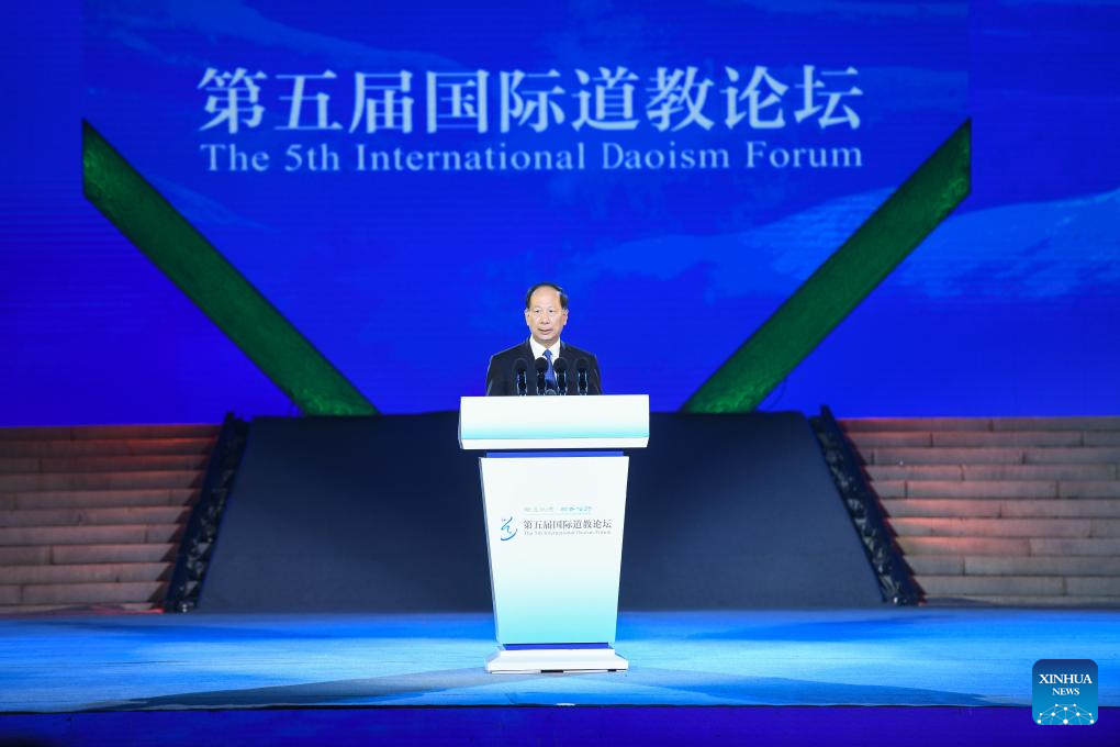 Shi Taifeng, a member of the Political Bureau of the Communist Party of China (CPC) Central Committee and head of the United Front Work Department of the CPC Central Committee, addresses the opening ceremony of the 5th International Daoism Forum at the Maoshan Mountain in east China's Jiangsu Province Sept. 24, 2023. The 5th International Daoism Forum on Sunday opened at the Maoshan Mountain in east China's Jiangsu Province. The event also saw the inauguration of the World Federation of Daoism. (Xinhua/Ji Chunpeng)