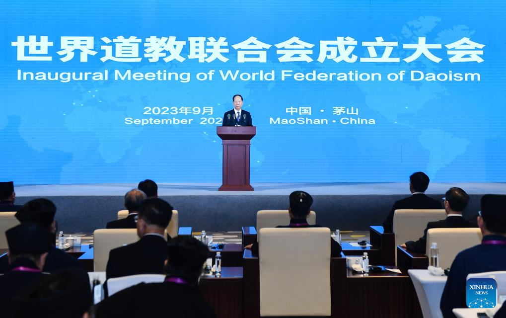 Shi Taifeng, a member of the Political Bureau of the Communist Party of China (CPC) Central Committee and head of the United Front Work Department of the CPC Central Committee, addresses the inaugural meeting of the World Federation of Daoism at the Maoshan Mountain in east China's Jiangsu Province Sept. 24, 2023. The 5th International Daoism Forum on Sunday opened at the Maoshan Mountain in east China's Jiangsu Province. The event also saw the inauguration of the World Federation of Daoism. (Xinhua/Ji Chunpeng)