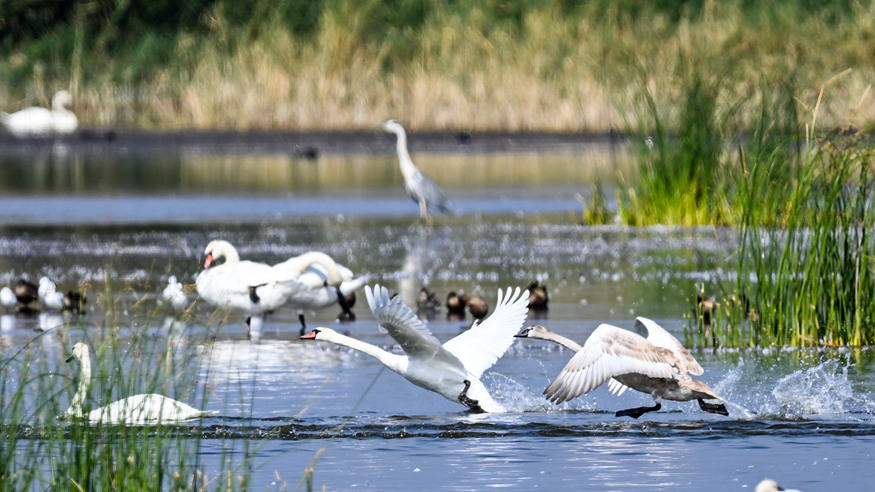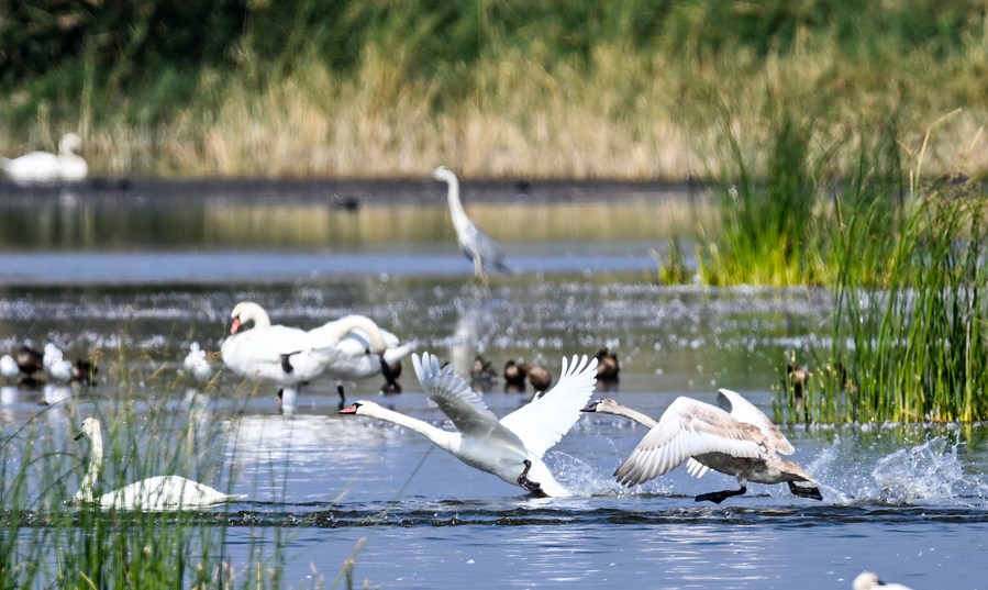 The Ulan Suhai Lake is now home to various kinds of migratory birds. It also serves as the largest breeding base of mute swans in China. Recently, mute swans on the Ulan Suhai Lake led fledglings to practice flying, preparing them for the long-distance migration before winter.