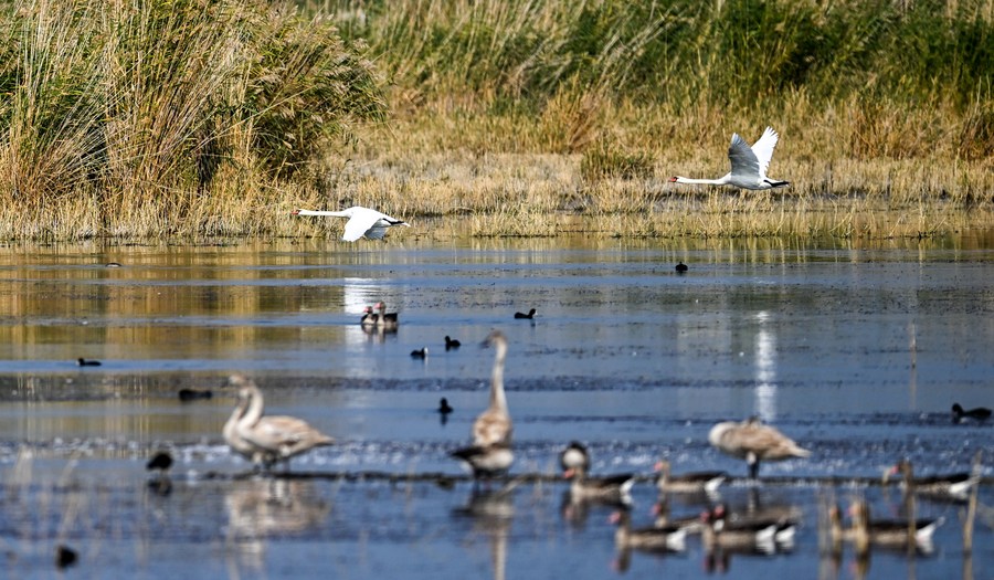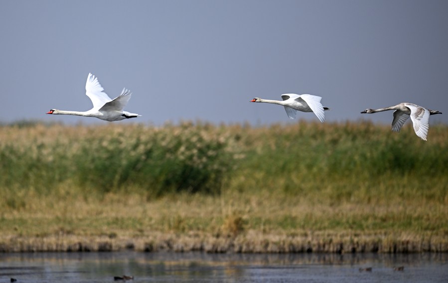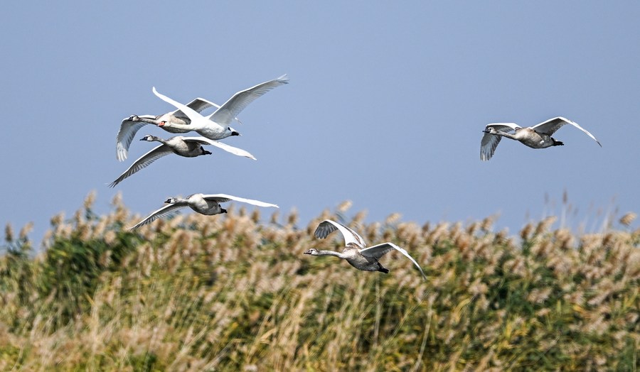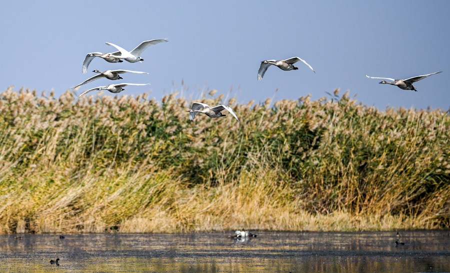 Mute swans fly above the Ulan Suhai Lake in Bayannur, north China's Inner Mongolia Autonomous Region, Sept. 24, 2023. (Xinhua/Lian Zhen)