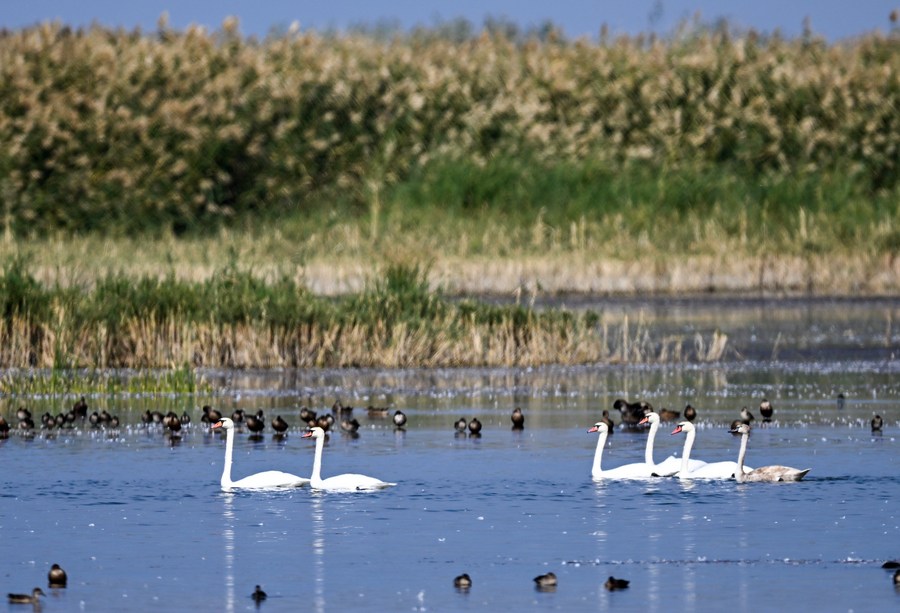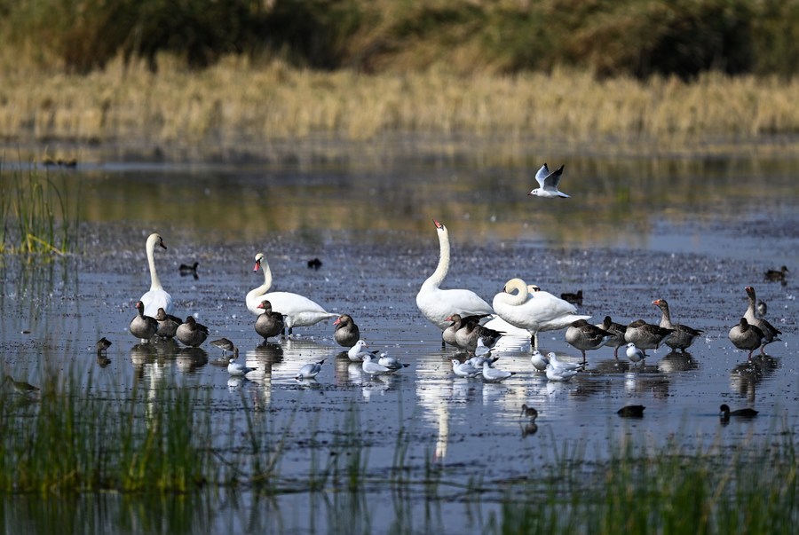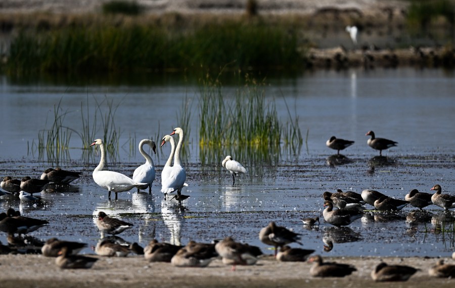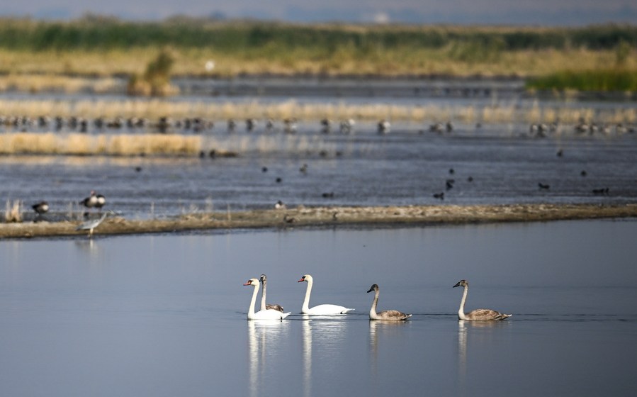 Mute swans are seen on the Ulan Suhai Lake in Bayannur, north China's Inner Mongolia Autonomous Region, Sept. 24, 2023. (Xinhua/Lian Zhen)