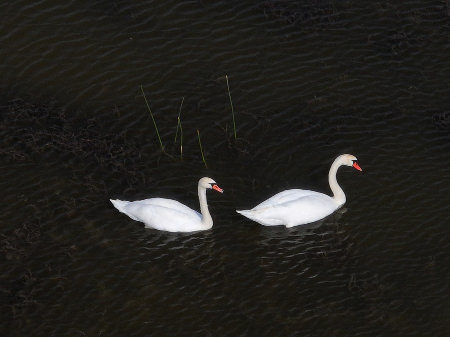 This photo taken on Sept. 14, 2023 shows a pair of mute swans foraging on the Ulan Suhai Lake in Bayannur, north China's Inner Mongolia Autonomous Region. (Xinhua/Xing Guangli)
