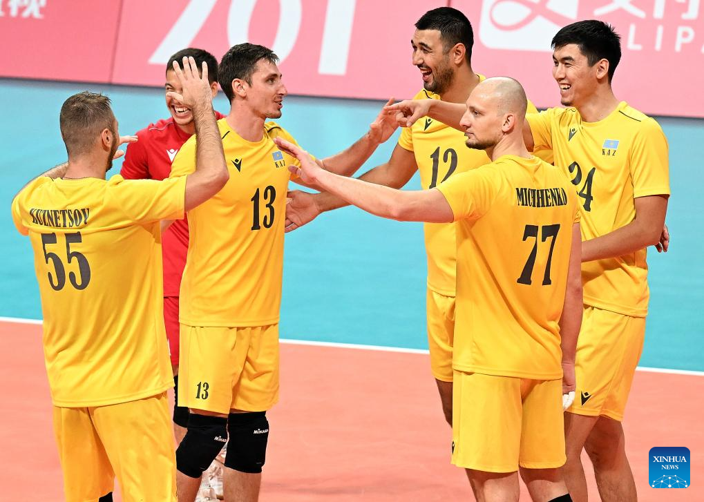 Players of Kazakhstan celebrate victory after the Volleyball Men's Classification 9th-10th match between Thailand and Kazakhstan at the 19th Asian Games in Shaoxing, east China's Zhejiang Province, Sept. 26, 2023. (Xinhua/Yang Guanyu)