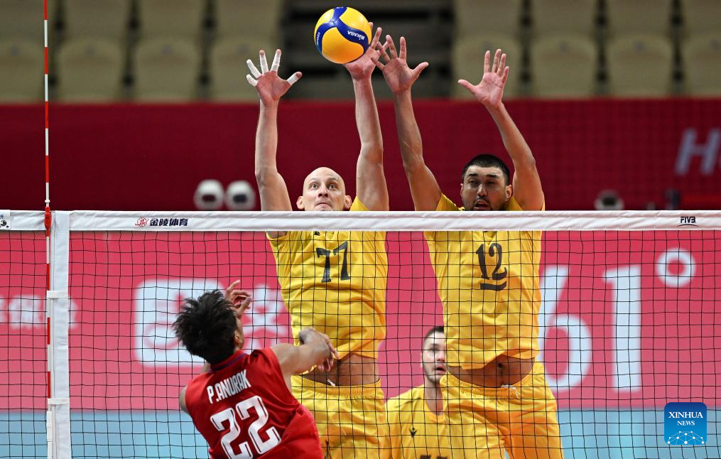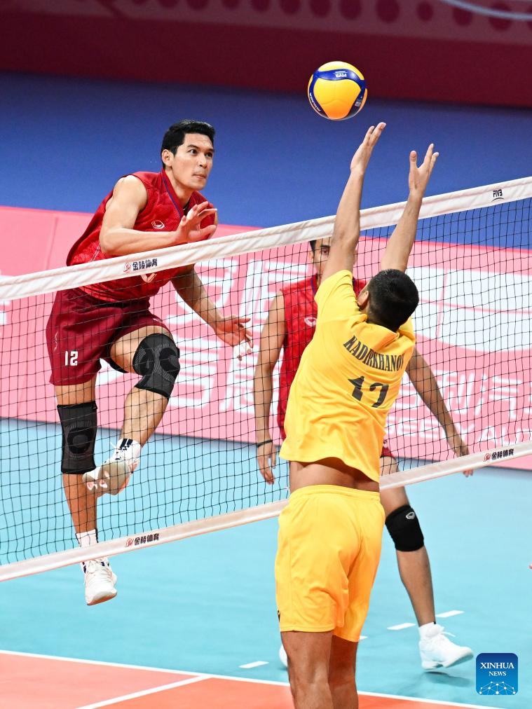 Vladislav Kunchenko (1st L) of Kazakhstan spikes the ball during the Volleyball Men's Classification 9th-10th match between Thailand and Kazakhstan at the 19th Asian Games in Shaoxing, east China's Zhejiang Province, Sept. 26, 2023. (Xinhua/Yang Guanyu)