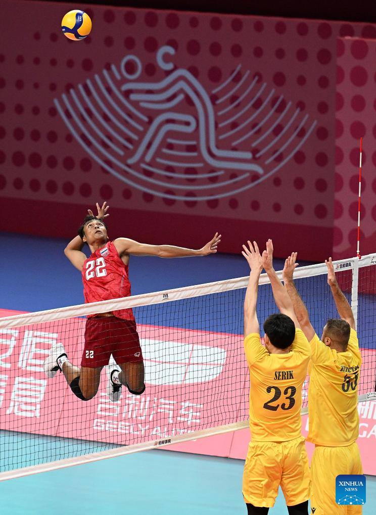 Thanathat Thaweerat (L) of Thailand spikes the ball during the Volleyball Men's Classification 9th-10th match between Thailand and Kazakhstan at the 19th Asian Games in Shaoxing, east China's Zhejiang Province, Sept. 26, 2023. (Xinhua/Yang Guanyu)