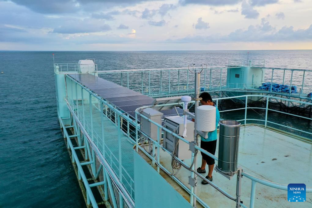 This aerial photo taken on Sept. 20, 2023 shows a staff member checking equipment on "Haiwei-2," an intelligent semi-submersible aquaculture platform in Liusha Bay of Zhanjiang, south China's Guangdong Province. "Haiwei-2" is a giant marine ranch carrying nearly 1 million golden pomfret fry of around 100 tonnes.