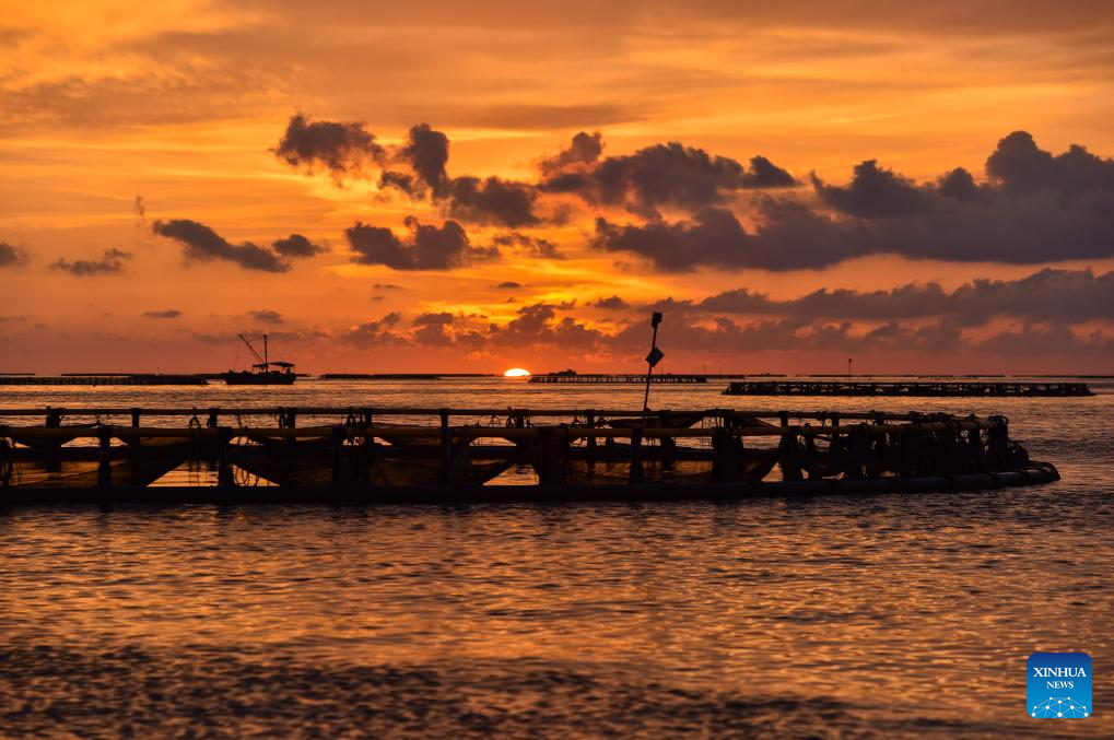 A marine ranch is pictured at sunset in Liusha Bay of Zhanjiang, south China's Guangdong Province, Sept. 20, 2023. "Haiwei-2" is a giant marine ranch carrying nearly 1 million golden pomfret fry of around 100 tonnes.