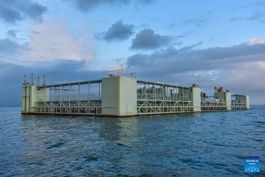 This photo taken on Sept. 20, 2023 shows the "Haiwei-2," an intelligent semi-submersible aquaculture platform in Liusha Bay of Zhanjiang, south China's Guangdong Province. "Haiwei-2" is a giant marine ranch carrying nearly 1 million golden pomfret fry of around 100 tonnes.