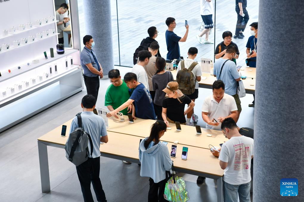 People buy smartphones at a flagship store of Huawei in Shenzhen, south China's Guangdong Province, Sept. 11, 2023. Chinese telecom giant Huawei held a product launch event on Monday in Shenzhen. (Xinhua/Liang Xu)