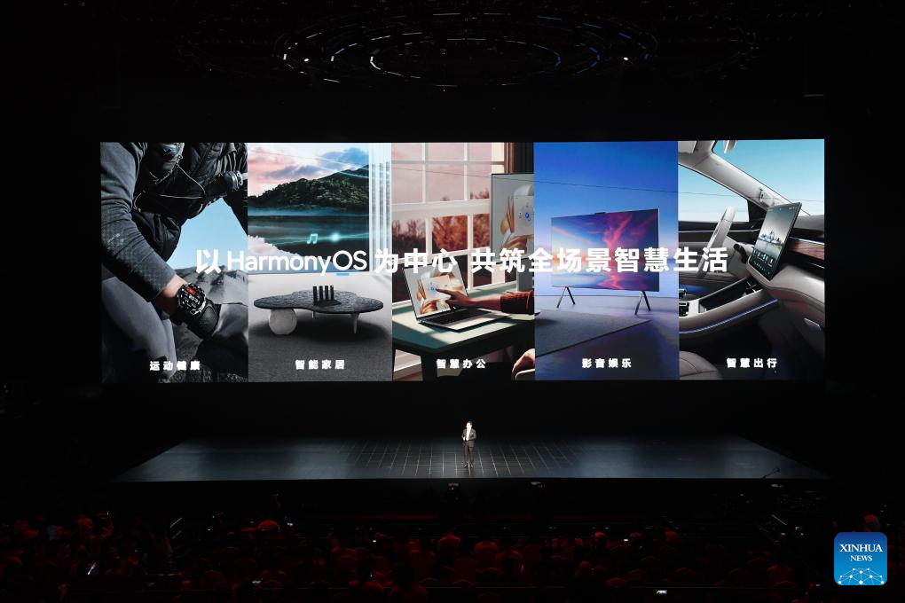 An intelligent lifestyle based on HarmonyOS is displayed at a product launch event of Huawei in Shenzhen, south China's Guangdong Province, Sept. 25, 2023. Chinese telecom giant Huawei held a product launch event on Monday in Shenzhen. (Xinhua/Liang Xu)