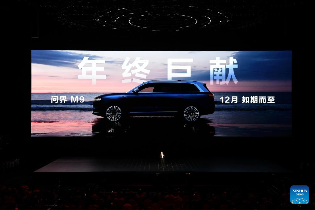 AITO M9 is displayed at a product launch event of Huawei in Shenzhen, south China's Guangdong Province, Sept. 25, 2023. Chinese telecom giant Huawei held a product launch event on Monday in Shenzhen. (Xinhua/Liang Xu)