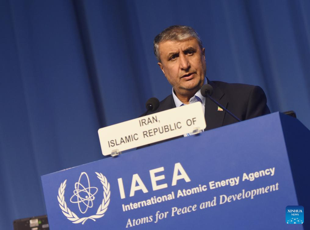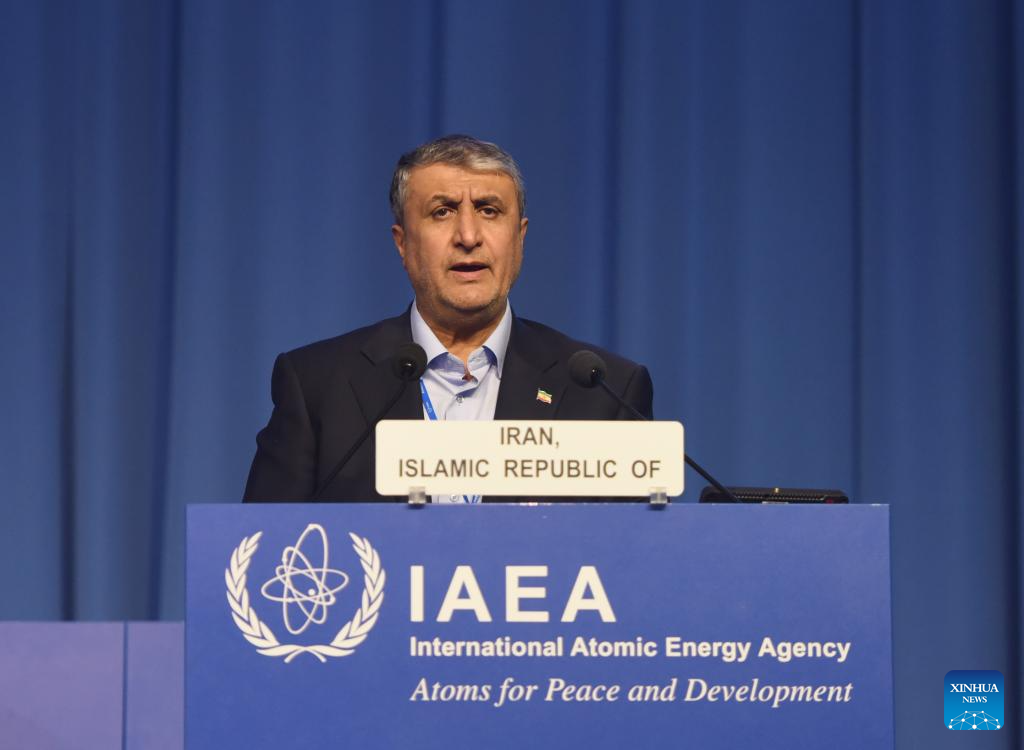 President of the Atomic Energy Organization of Iran (AEOI) Mohammad Eslami delivers a speech at the 67th General Conference of the International Atomic Energy Agency (IAEA) in Vienna, Austria, on Sept. 25, 2023. (Xinhua/He Canling)