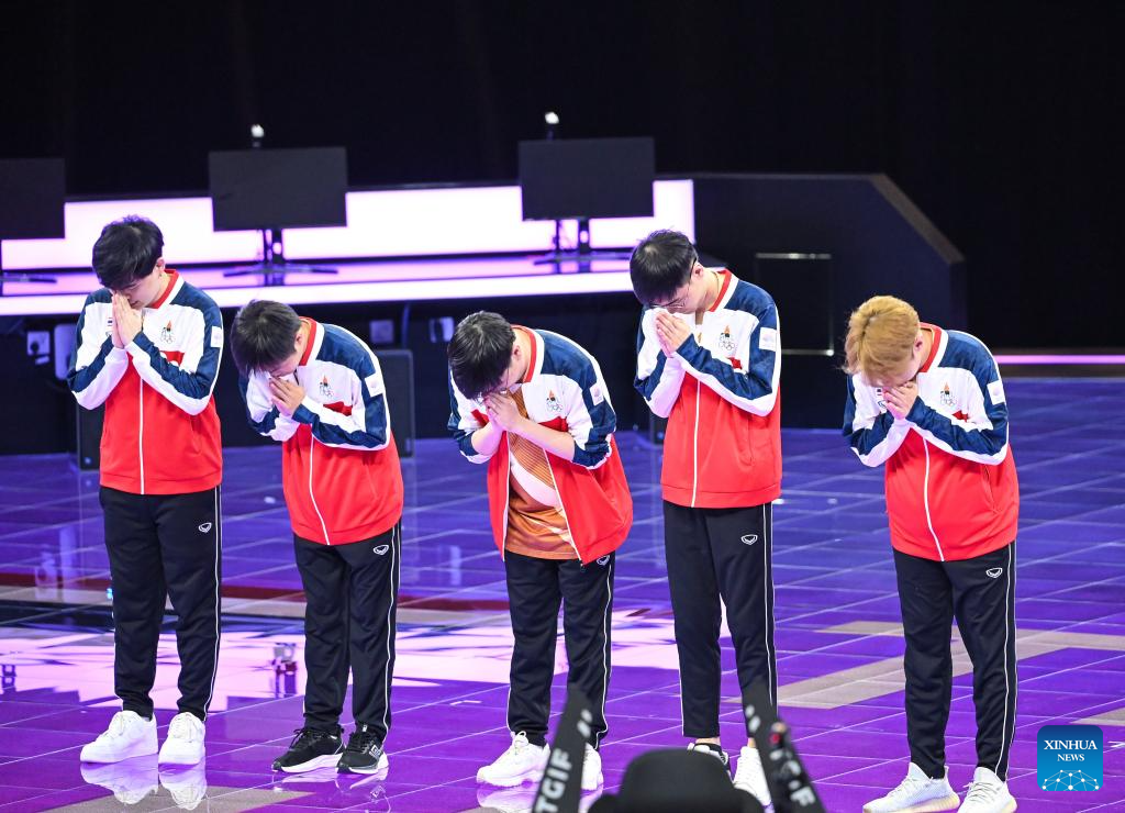 Players of team Thailand gesture to spectators after the Arena of Valor Asian Games Version Bronze Medal Match of Esports between Thailand and Vietnam at the 19th Asian Games in Hangzhou, east China's Zhejiang Province, Sept. 26, 2023. (Xinhua/Yan Linyun)