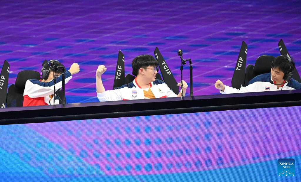 Team Thailand compete during the Arena of Valor Asian Games Version Bronze Medal Match of Esports between Thailand and Vietnam at the 19th Asian Games in Hangzhou, east China's Zhejiang Province, Sept. 26, 2023. (Xinhua/Yan Linyun)
