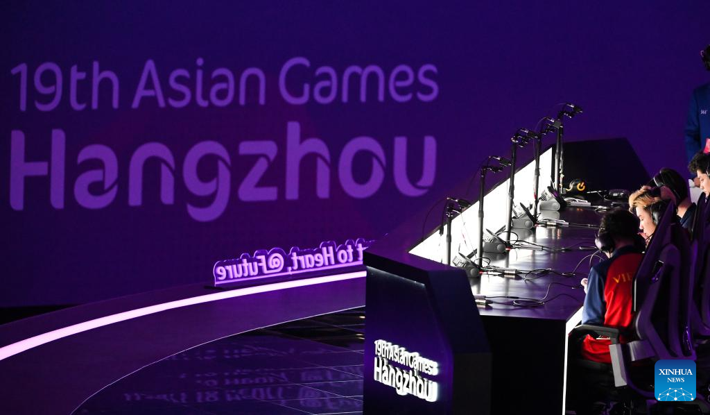 Team Vietnam compete during the Arena of Valor Asian Games Version Bronze Medal Match of Esports between Thailand and Vietnam at the 19th Asian Games in Hangzhou, east China's Zhejiang Province, Sept. 26, 2023. (Xinhua/Yan Linyun)