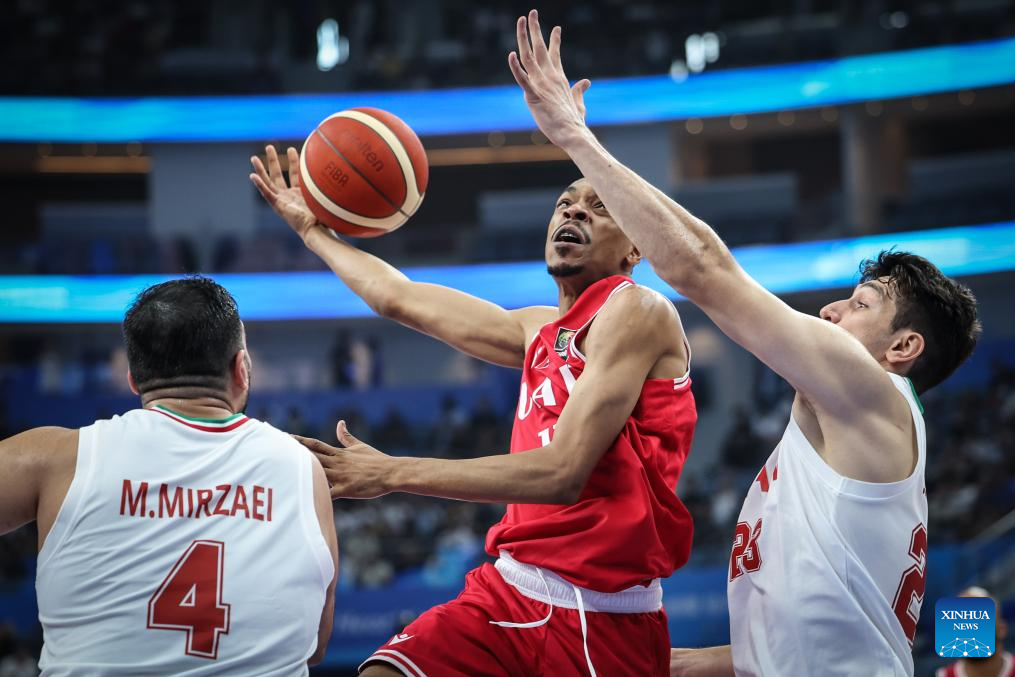 Rashed Naser Saeed Albada Alzaabi (C) of the United Arab Emirates goes for a layup during the Men's Preliminary Round match of Basketball between Iran and the United Arab Emirates at the 19th Asian Games in Hangzhou, east China's Zhejiang Province, Sept. 26, 2023. (Xinhua/Pan Yulong)
