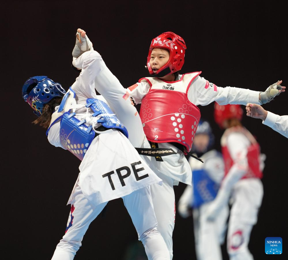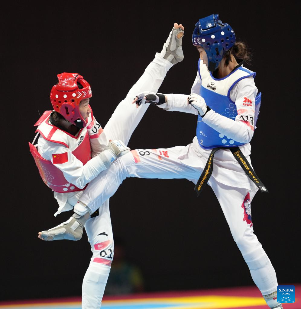 Zuo Ju (R) of China competes against Lin Wei Chun of Chinese Taipei during the Women's 53kg Quarterfinal of Taekwondo at the 19th Asian Games in Hangzhou, east China's Zhejiang Province, Sept. 26, 2023. (Xinhua/Jiang Wenyao)