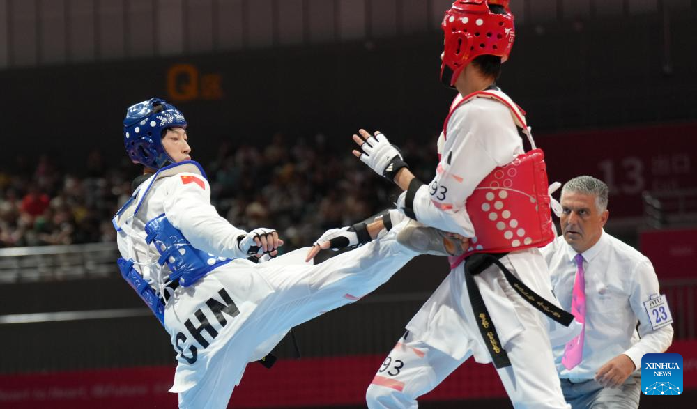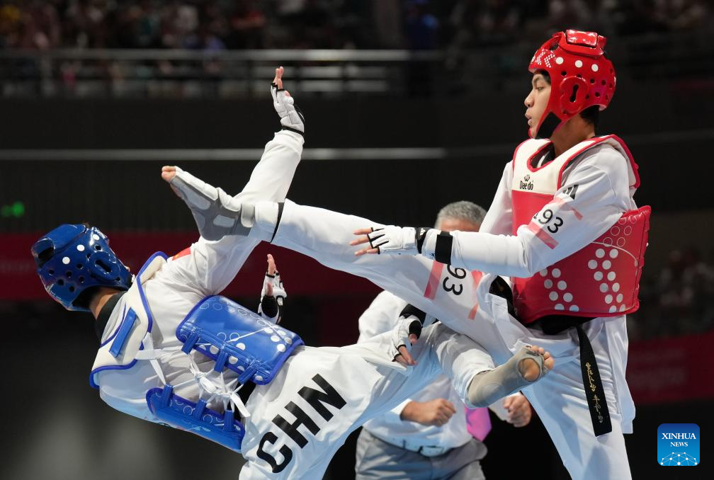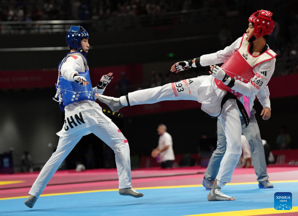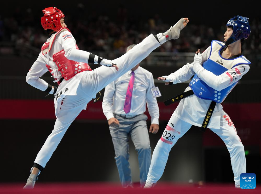 Liang Yushuai (R) of China competes against Banlung Tubtimdang of Thailand during the Men's 63kg Semifinal of Taekwondo at the 19th Asian Games in Hangzhou, east China's Zhejiang Province, Sept. 26, 2023. (Xinhua/Jiang Wenyao)