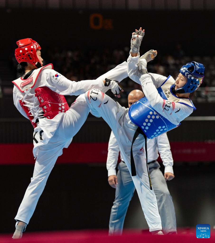 Luo Zongshi (R) of China competes against Kim Yujin of South Korea during the Women's 57kg Semifinal of Taekwondo at the 19th Asian Games in Hangzhou, east China's Zhejiang Province, Sept. 26, 2023. (Xinhua/Jiang Wenyao)