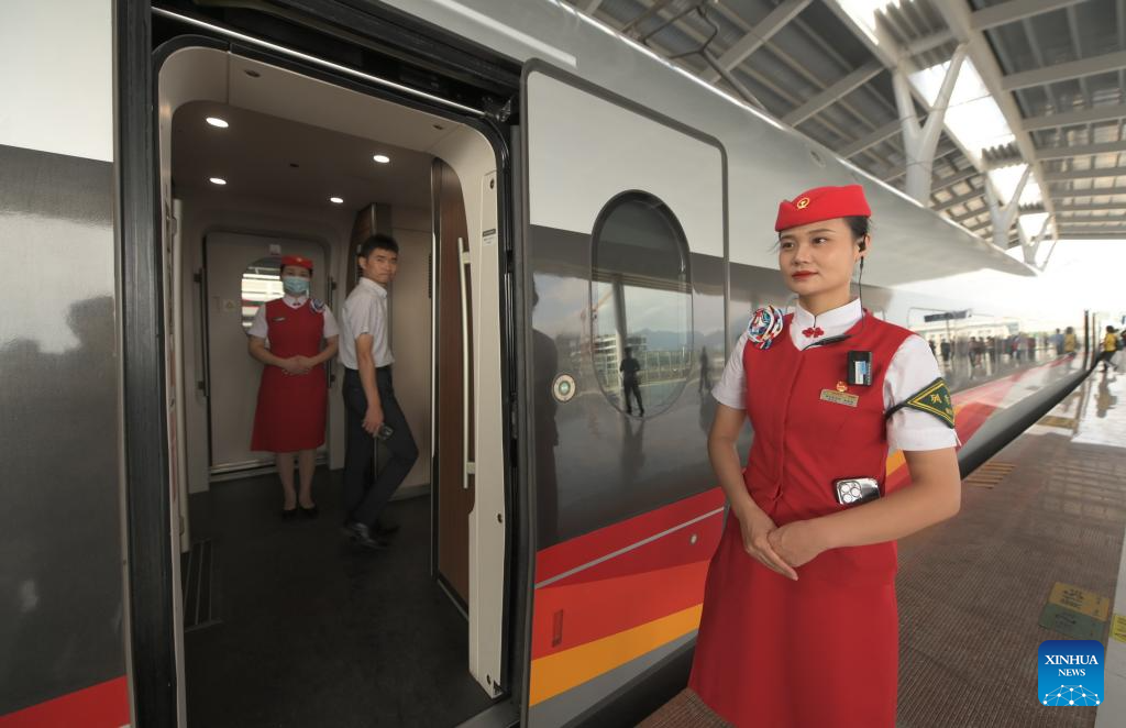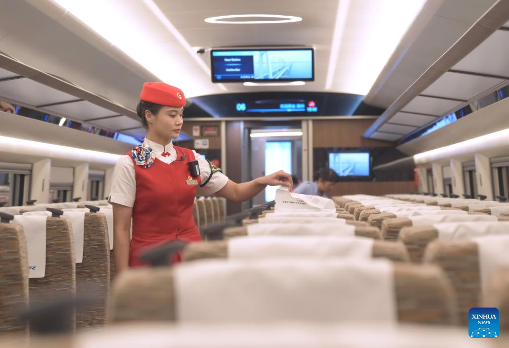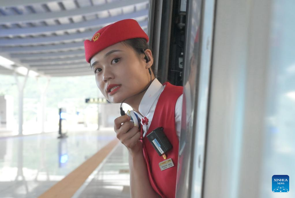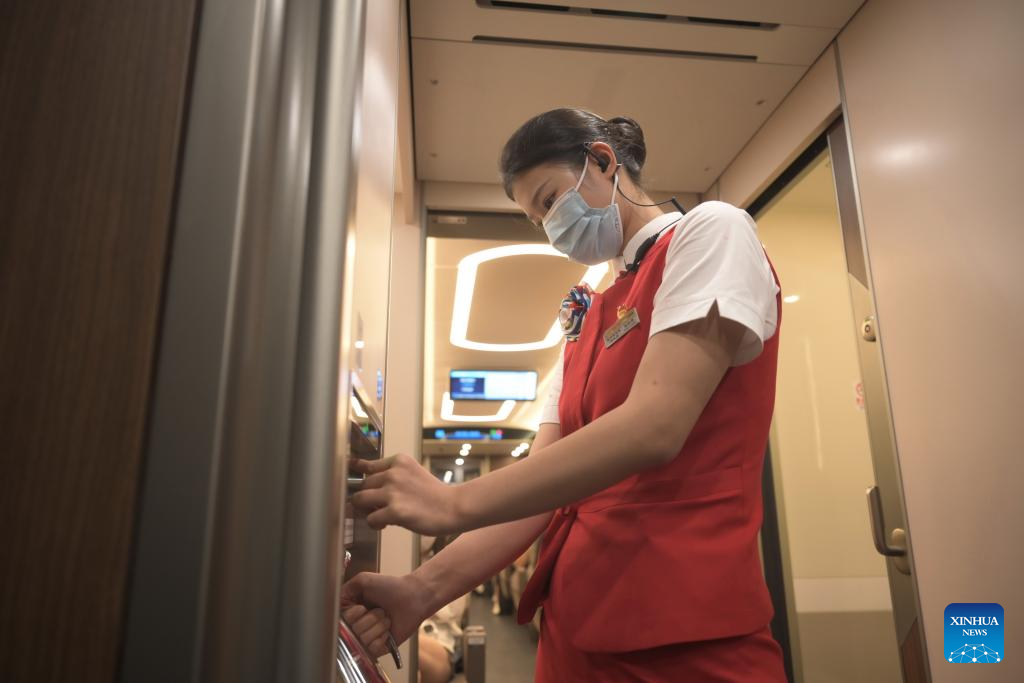 Train attendant Zhao Yijun works on the Fuxing bullet train G9801, Sept. 28, 2023. China's fastest cross-sea high-speed rail started operation on Thursday, with trains running at a maximum speed of 350 km/h along the west coast of the Taiwan Strait.