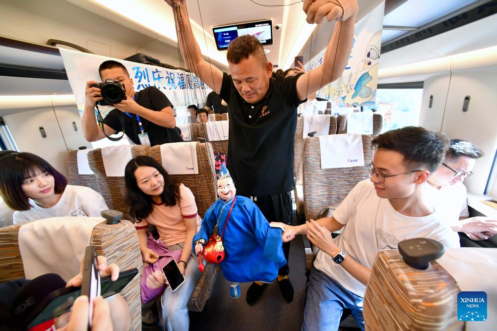 A performer puts on a puppet show on the Fuxing bullet train G9801 operating on the Fuzhou-Xiamen-Zhangzhou high-speed railway in southeast China's Fujian Province, Sept. 28, 2023.