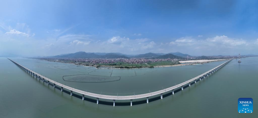 This aerial photo taken on Sept. 19, 2023 shows the Anhai Bay cross-sea bridge along the Fuzhou-Xiamen-Zhangzhou high-speed railway in southeast China's Fujian Province.