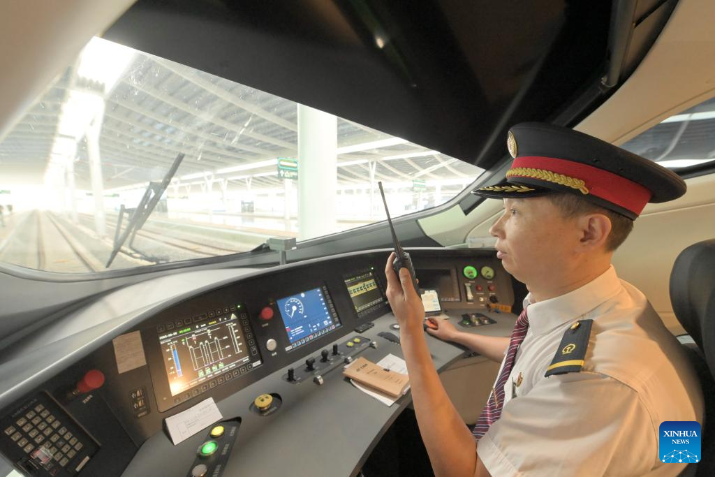 Chen Chengyi, the driver of the Fuxing bullet train G9801, makes preparations before departure at Fuzhou south railway station along Fuzhou-Xiamen-Zhangzhou high-speed railway, southeast China's Fujian Province, Sept. 28, 2023. China's fastest cross-sea high-speed rail started operation on Thursday, with trains running at a maximum speed of 350 km/h along the west coast of the Taiwan Strait.