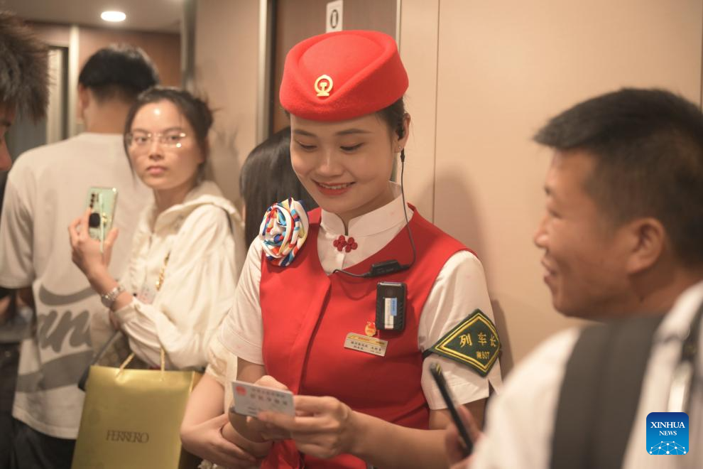 Chief conductor Che Yanxue provides ticket service for a passenger on the Fuxing bullet train G9801, Sept. 28, 2023. China's fastest cross-sea high-speed rail started operation on Thursday, with trains running at a maximum speed of 350 km/h along the west coast of the Taiwan Strait.