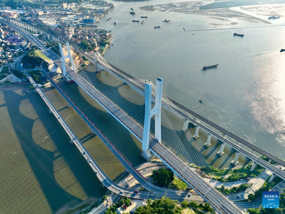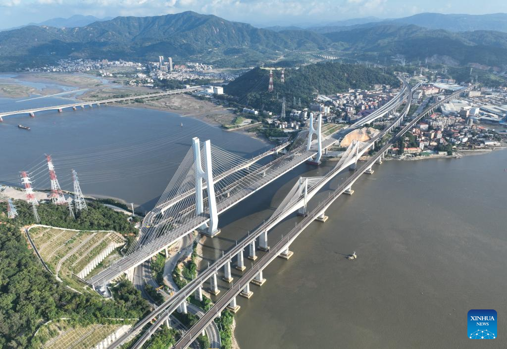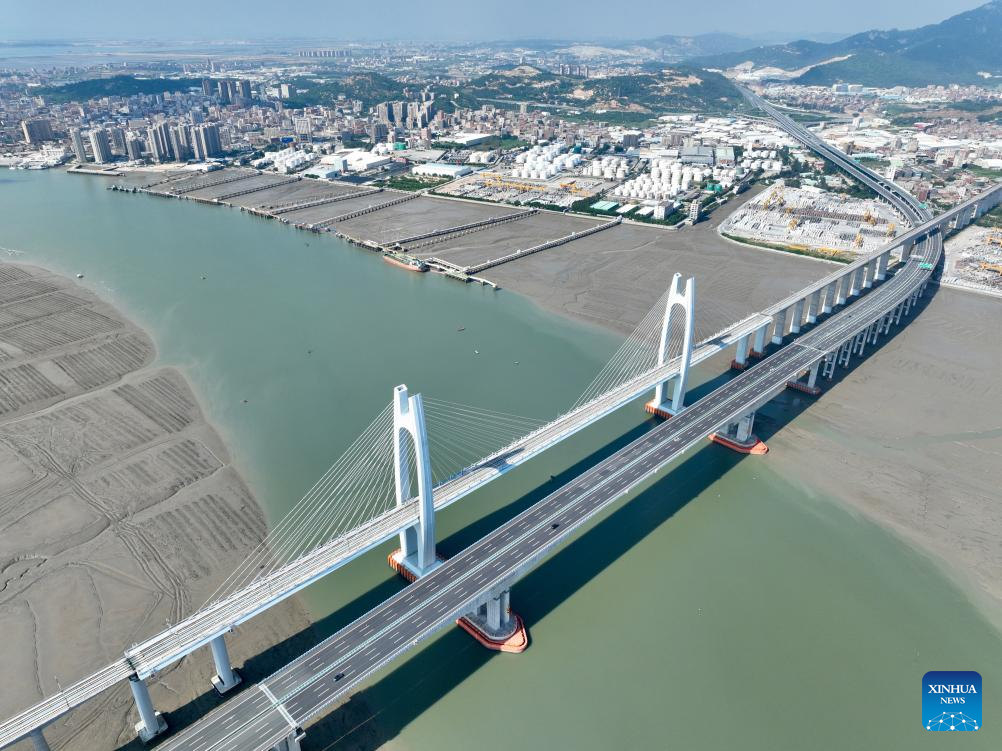 This aerial photo taken on Sept. 19, 2023 shows the Anhai Bay cross-sea bridge (L) along the Fuzhou-Xiamen-Zhangzhou high-speed railway in southeast China's Fujian Province.