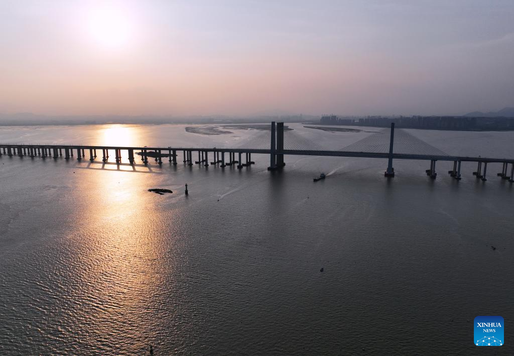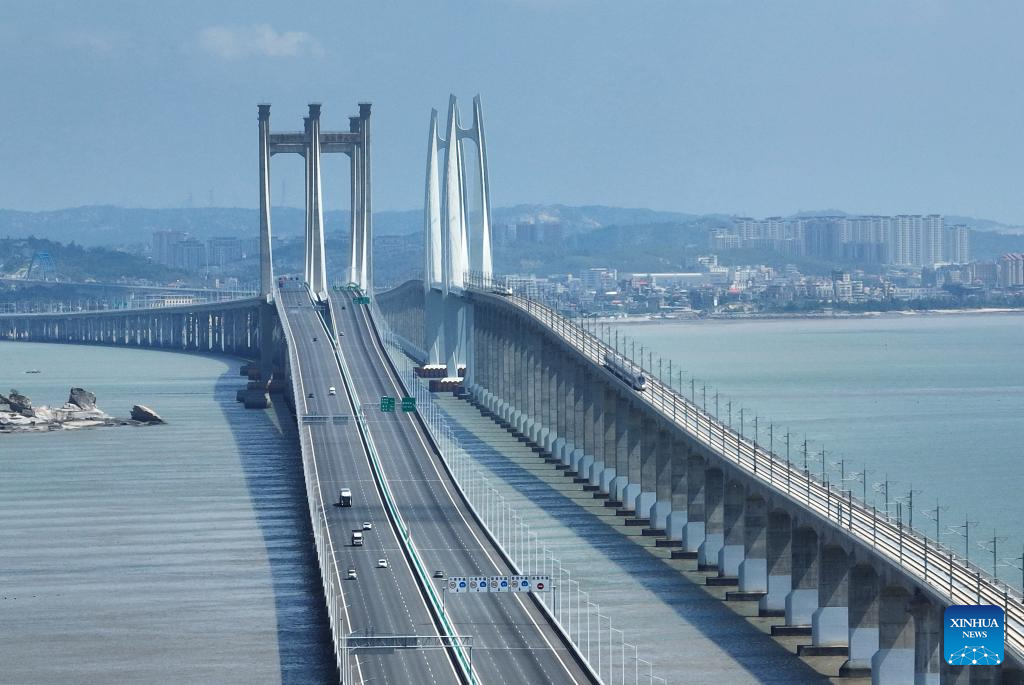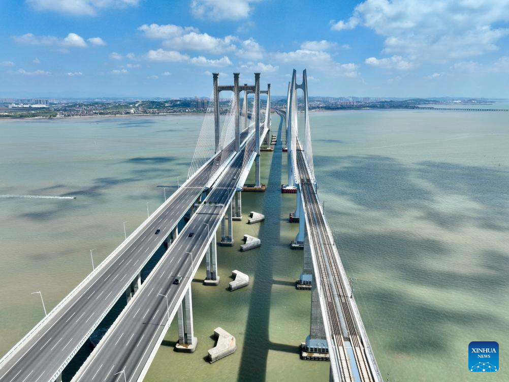 This aerial photo taken on Sept. 19, 2023 shows a part of the Anhai Bay cross-sea bridge along the Fuzhou-Xiamen-Zhangzhou high-speed railway in southeast China's Fujian Province.