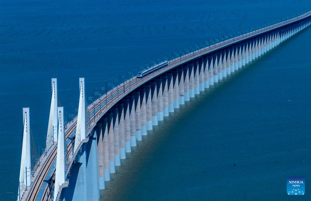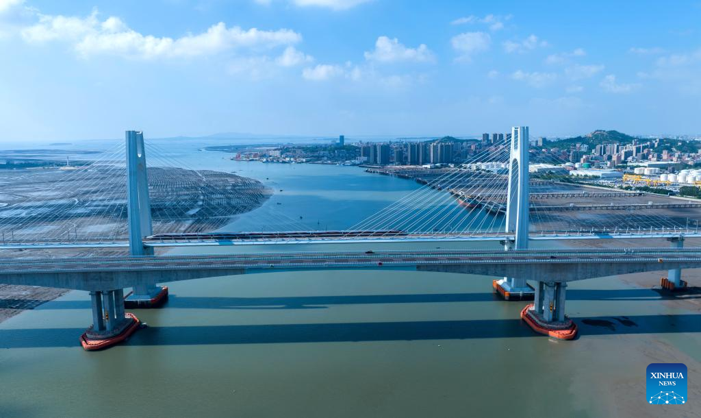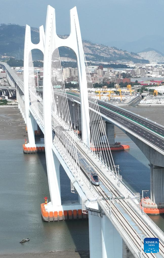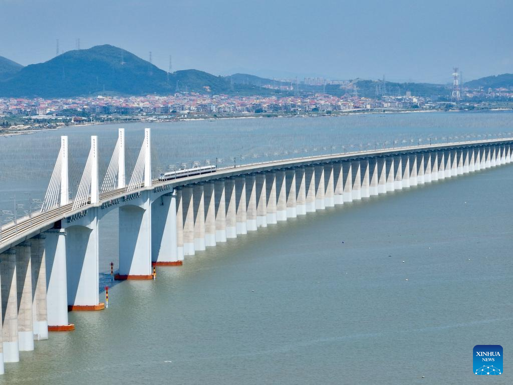 This aerial photo taken on Sept. 19, 2023 shows a test train running on the Meizhou Bay cross-sea bridge along the Fuzhou-Xiamen-Zhangzhou high-speed railway in southeast China's Fujian Province.