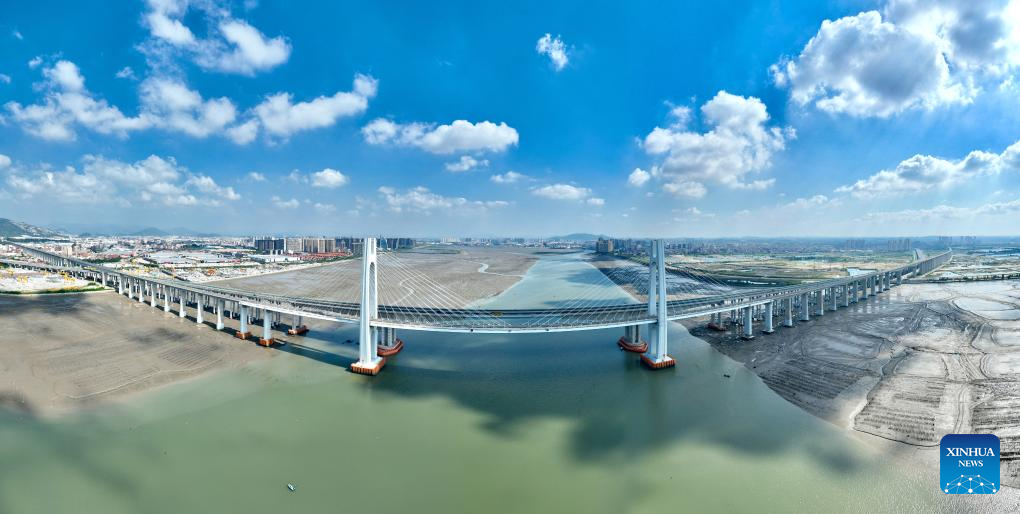 This stitched aerial panorama taken on Sept. 18, 2023 shows the Quanzhou Bay cross-sea bridge along the Fuzhou-Xiamen-Zhangzhou high-speed railway in southeast China's Fujian Province.