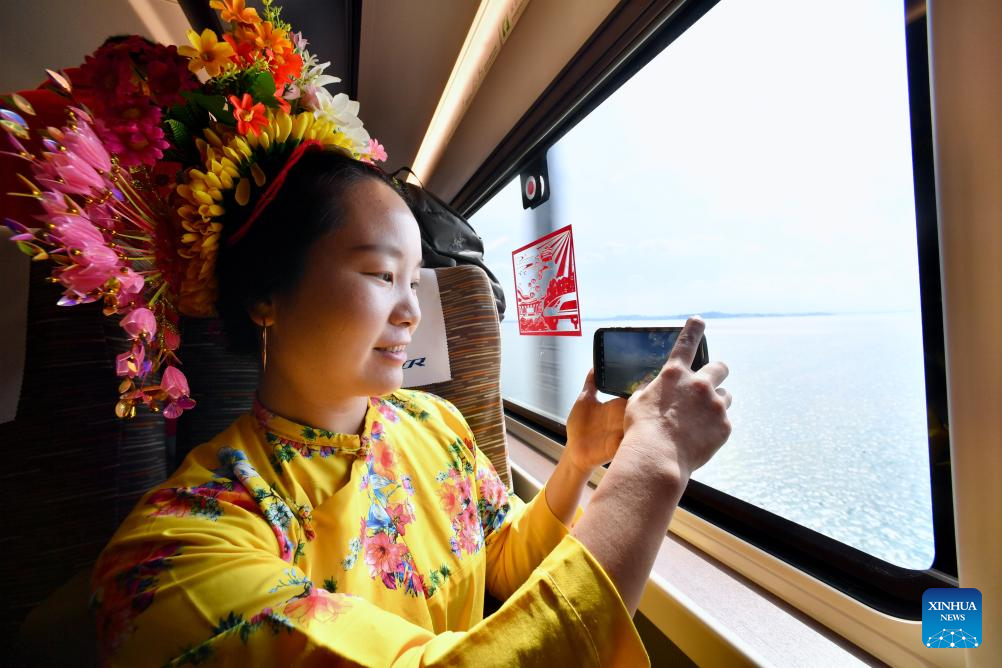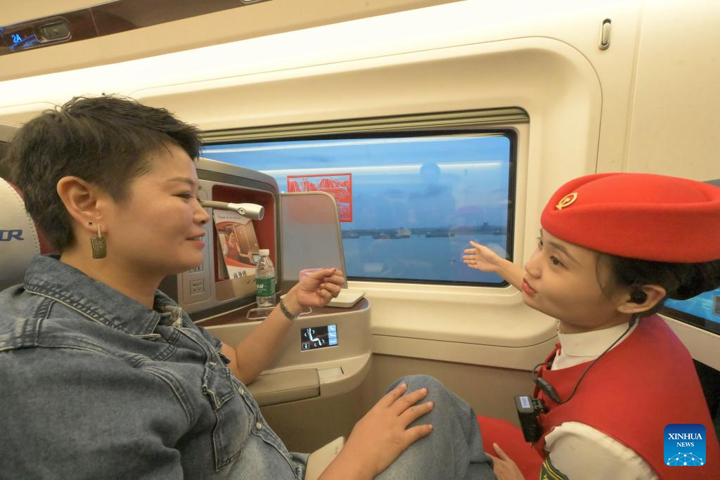 Che Yanxue, the train conductor, said the Fuxing trains running on the line have more spacious seating areas, more comfortable inverter air conditioners and reduced noise levels. "The train runs very steadily. There is hardly any bump when the train crosses the sea."