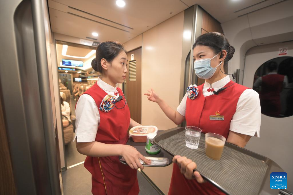 Train attendant Zhao Yijun (R) and her colleague conduct food service on the Fuxing bullet train G9801, Sept. 28, 2023. China's fastest cross-sea high-speed rail started operation on Thursday, with trains running at a maximum speed of 350 km/h along the west coast of the Taiwan Strait.