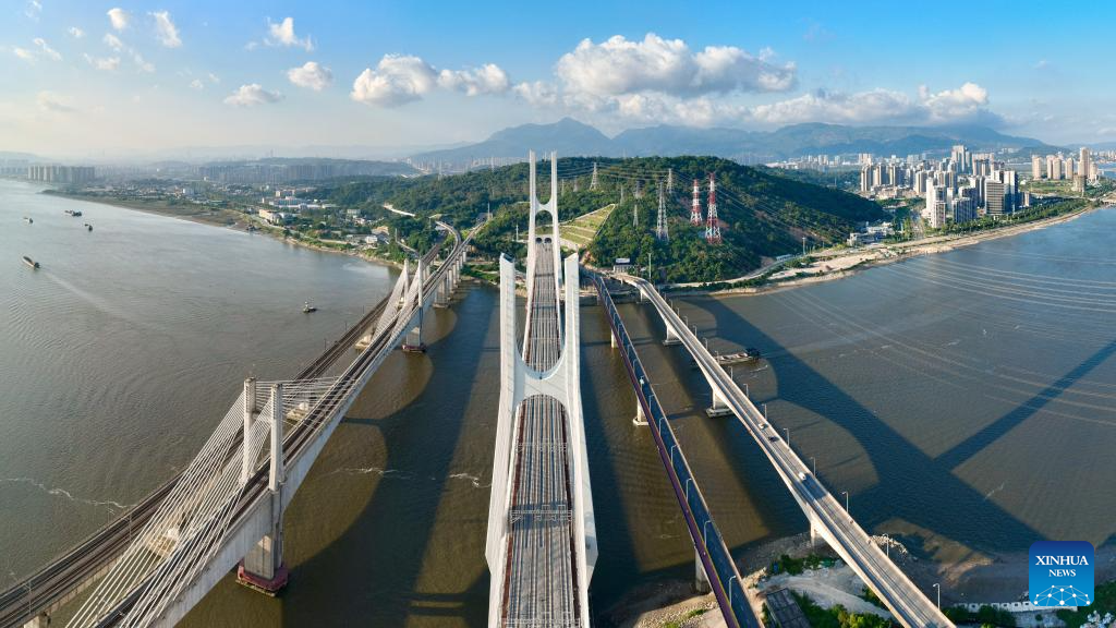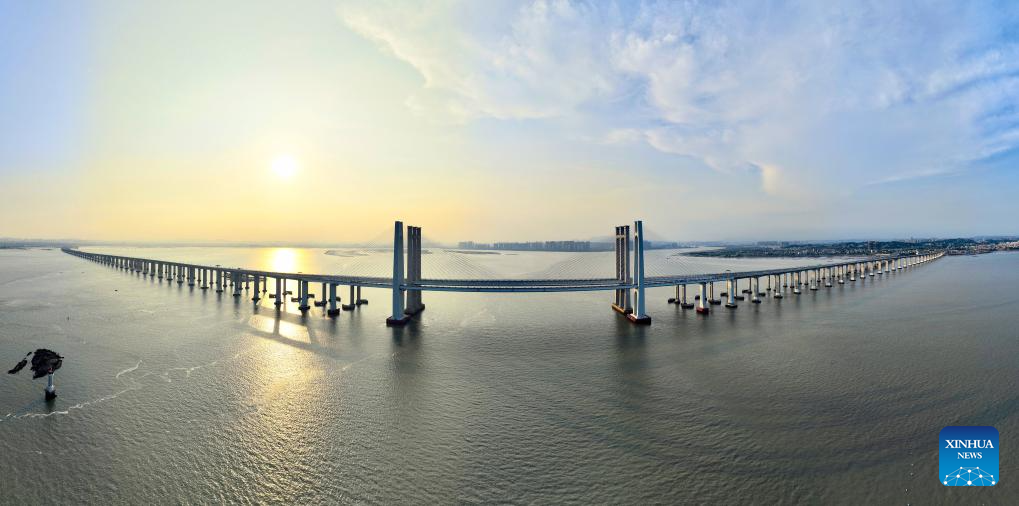 This aerial photo taken on Sept. 19, 2023 shows the Meizhou Bay cross-sea bridge along the Fuzhou-Xiamen-Zhangzhou high-speed railway in southeast China's Fujian Province.