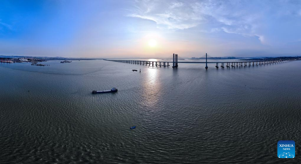 This stitched aerial panorama taken on Sept. 15, 2023 shows the Meizhou Bay cross-sea bridge along the Fuzhou-Xiamen-Zhangzhou high-speed railway in southeast China's Fujian Province.