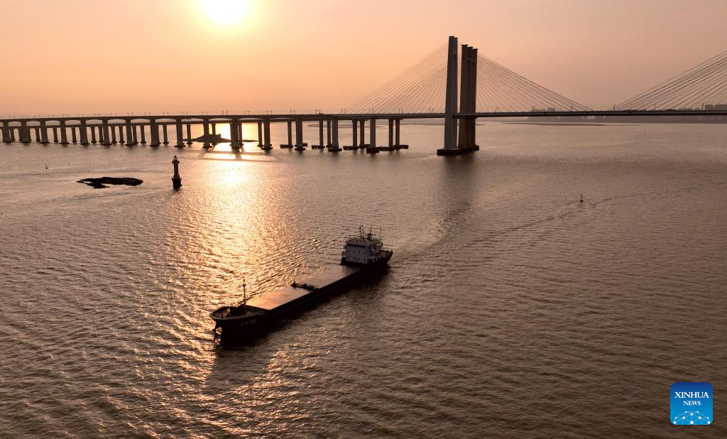 This aerial photo taken on Sept. 18, 2023 shows a cargo ship sailing towards the Quanzhou Bay cross-sea bridge along the Fuzhou-Xiamen-Zhangzhou high-speed railway in southeast China's Fujian Province.