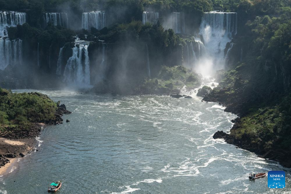 Tourists take boat tours visiting Iguazu National Park in the state of Parana, Brazil, Oct. 1, 2023. (Xinhua/Wang Tiancong)