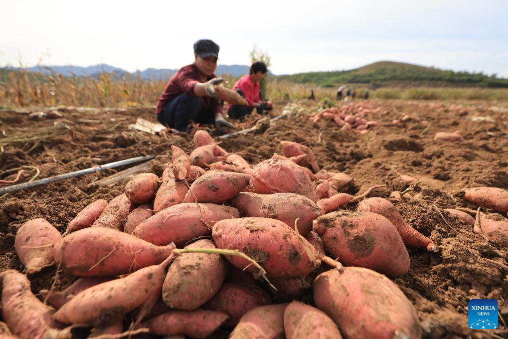 Farmers harvest sweet potatoes in Qianxi County of Tangshan, north China's Hebei Province, Oct. 4, 2023. (Photo by Wang Aijun/Xinhua)