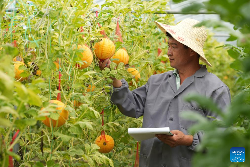 A technician checks the growth of melons at a plantation in Xinhua District of Shijiazhuang, north China's Hebei Province, Oct. 4, 2023. (Xinhua/Mu Yu)