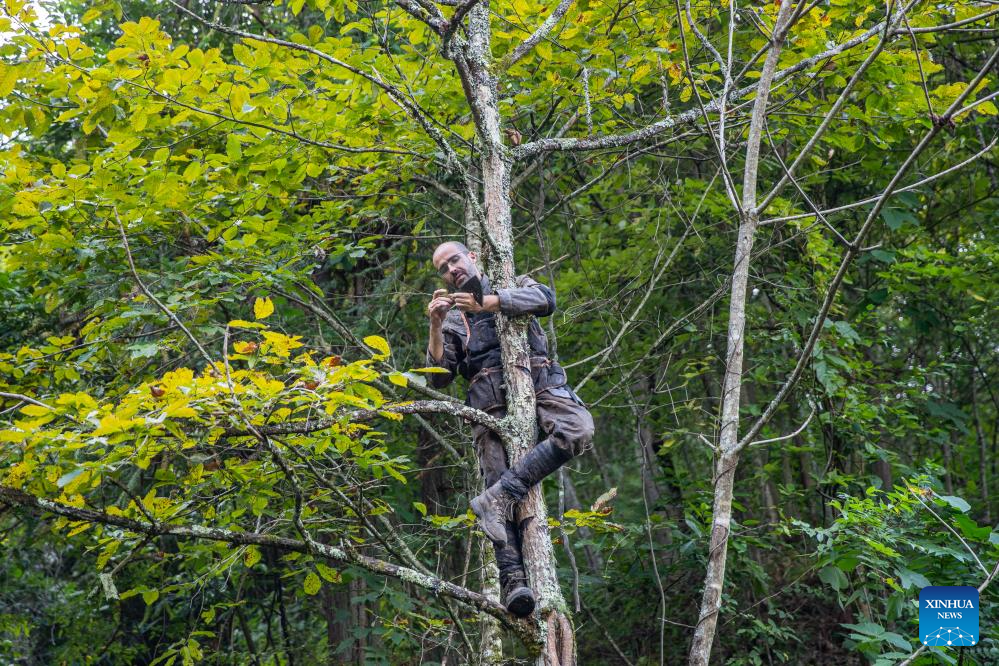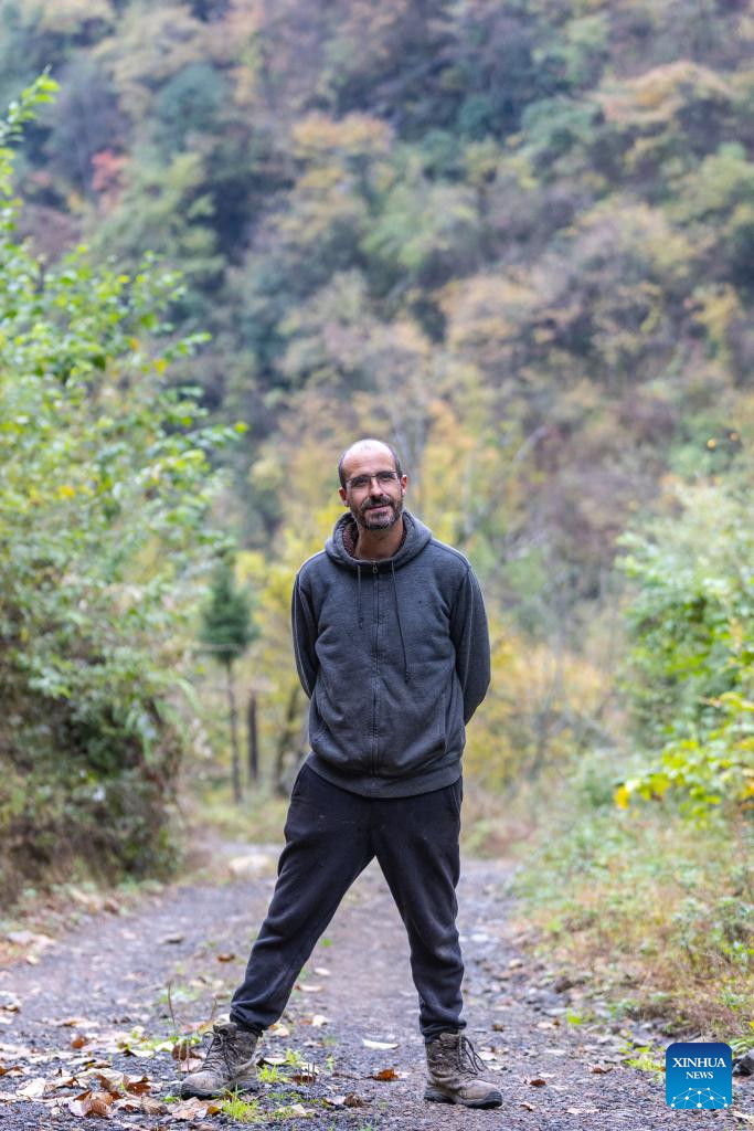 This photo taken on Oct. 26, 2023 shows Vincent Cazeneuve in Songbai Village of Chengkou County, southwest China's Chongqing Municipality. The Qinling-Daba mountain areas of southwest China are rich in lacquer trees. Located deep in the Daba Mountains, Chengkou County in southwest China's Chongqing produces Damu lacquer with strong adhesion and high gloss. (Xinhua/Chu Jiayin)