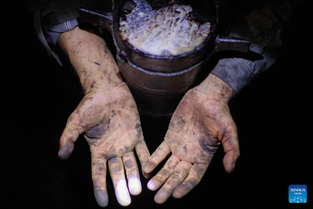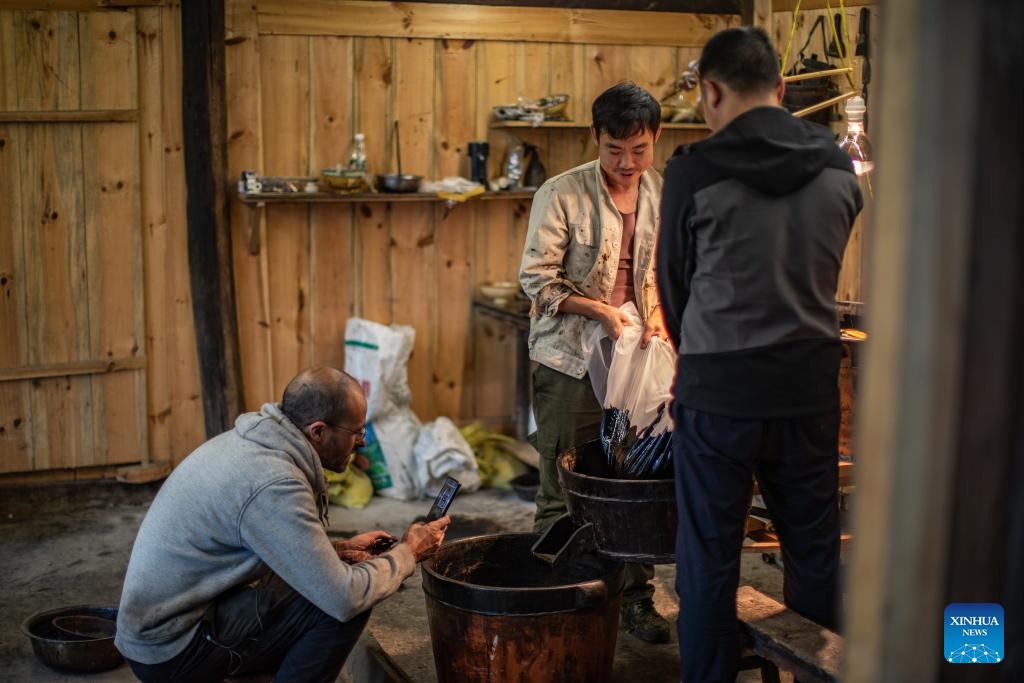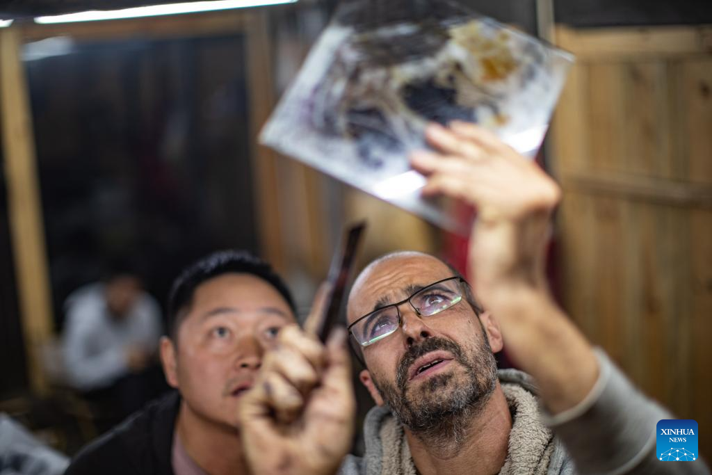 Vincent Cazeneuve shows newly collected lacquer to his tutor Yang Tianlun at his studio in Songbai Village of Chengkou County, southwest China's Chongqing Municipality, Oct. 26, 2023. The Qinling-Daba mountain areas of southwest China are rich in lacquer trees. Located deep in the Daba Mountains, Chengkou County in southwest China's Chongqing produces Damu lacquer with strong adhesion and high gloss. (Xinhua/Chu Jiayin)
