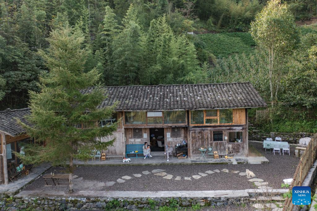 This aerial photo taken on Sept. 16, 2023 shows Vincent Cazeneuve and his family enjoying leisure time in Songbai Village of Chengkou County, southwest China's Chongqing Municipality. The Qinling-Daba mountain areas of southwest China are rich in lacquer trees. Located deep in the Daba Mountains, Chengkou County in southwest China's Chongqing produces Damu lacquer with strong adhesion and high gloss. (Xinhua/Huang Wei)
