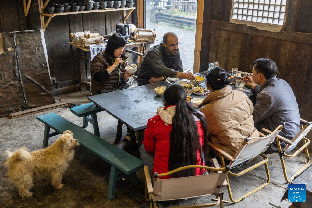 Vincent Cazeneuve and his apprentices have lunch at his studio in Songbai Village of Chengkou County, southwest China's Chongqing Municipality, Oct. 25, 2023. The Qinling-Daba mountain areas of southwest China are rich in lacquer trees. Located deep in the Daba Mountains, Chengkou County in southwest China's Chongqing produces Damu lacquer with strong adhesion and high gloss. (Xinhua/Chu Jiayin)