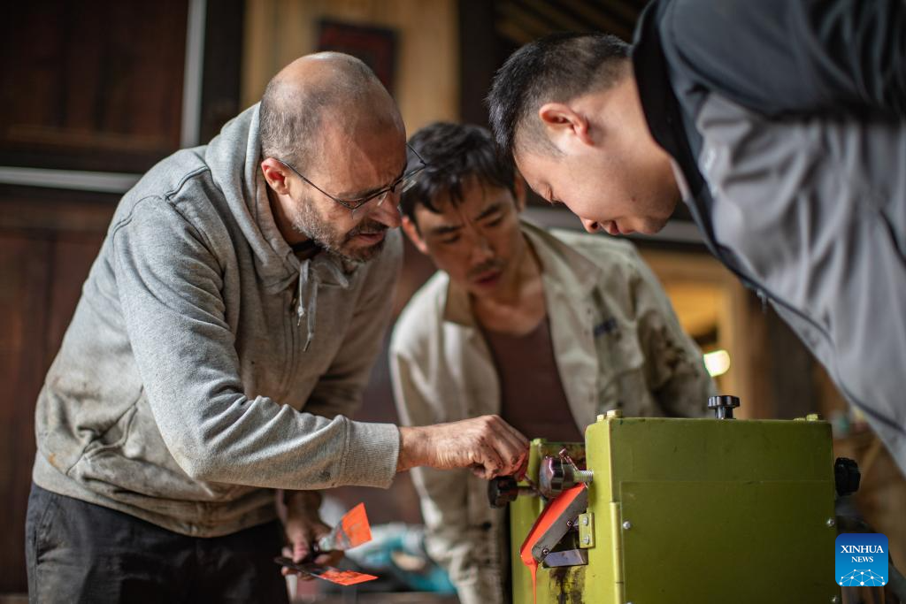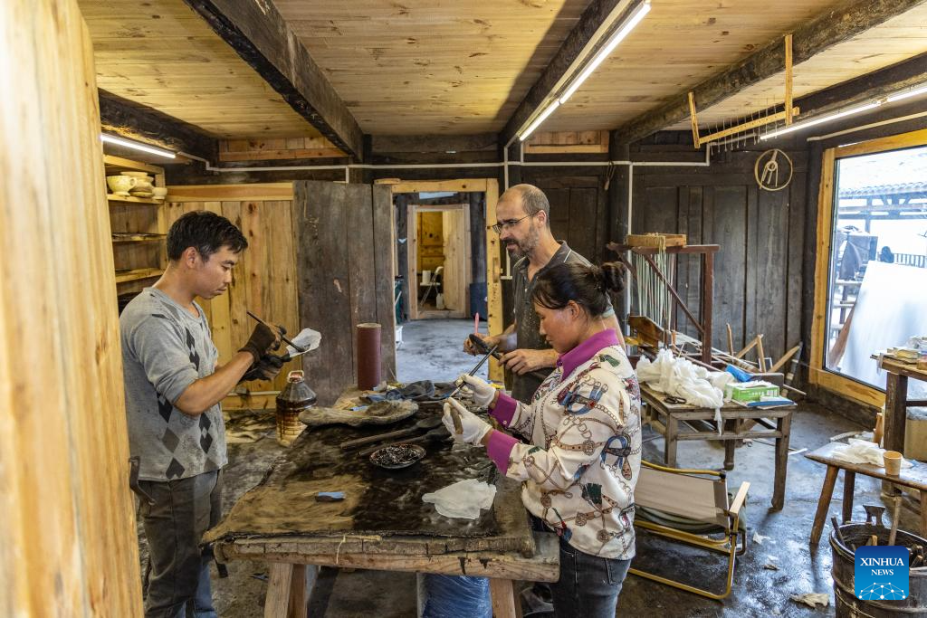 Vincent Cazeneuve (C) tutors his apprentices at his studio in Songbai Village of Chengkou County, southwest China's Chongqing Municipality, May 29, 2023. The Qinling-Daba mountain areas of southwest China are rich in lacquer trees. Located deep in the Daba Mountains, Chengkou County in southwest China's Chongqing produces Damu lacquer with strong adhesion and high gloss. (Xinhua/Huang Wei)