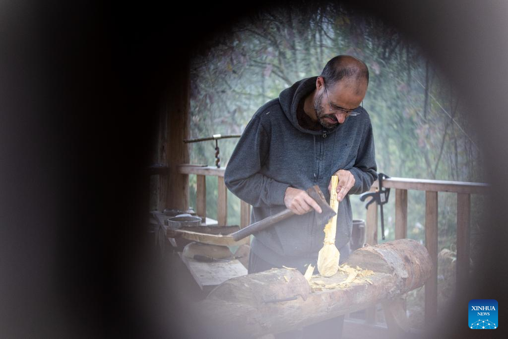 Vincent Cazeneuve makes a wood spoon in Songbai Village of Chengkou County, southwest China's Chongqing Municipality, Oct. 25, 2023. The Qinling-Daba mountain areas of southwest China are rich in lacquer trees. Located deep in the Daba Mountains, Chengkou County in southwest China's Chongqing produces Damu lacquer with strong adhesion and high gloss. (Xinhua/Chu Jiayin)