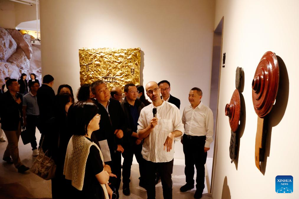 Vincent Cazeneuve (R, front) introduces his artwork during an exhibition in southwest China's Chongqing Municipality, April 27, 2023. The Qinling-Daba mountain areas of southwest China are rich in lacquer trees. Located deep in the Daba Mountains, Chengkou County in southwest China's Chongqing produces Damu lacquer with strong adhesion and high gloss. (Xinhua)