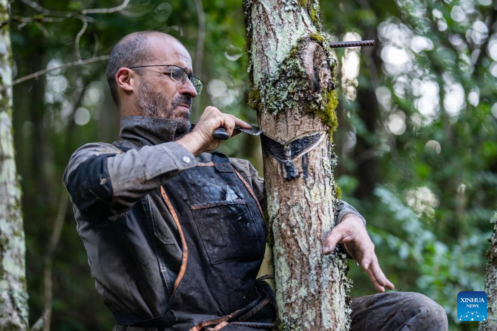 Vincent Cazeneuve taps a lacquer tree in the deep mountains of Songbai Village of Chengkou County, southwest China's Chongqing Municipality, Sept. 15, 2023. The Qinling-Daba mountain areas of southwest China are rich in lacquer trees. Located deep in the Daba Mountains, Chengkou County in southwest China's Chongqing produces Damu lacquer with strong adhesion and high gloss. (Xinhua/Chu Jiayin)