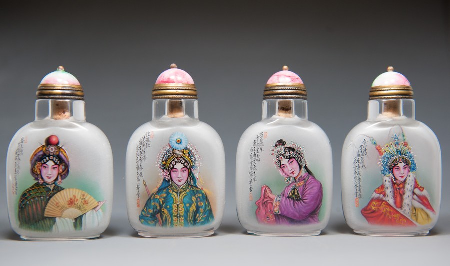 Photo taken on July 18, 2017 shows four inside-painted glass snuff bottles created by Dong Xue, an inside-painting artist, in Shijiazhuang, capital of north China's Hebei Province. (Xinhua/Pu Dongfeng)