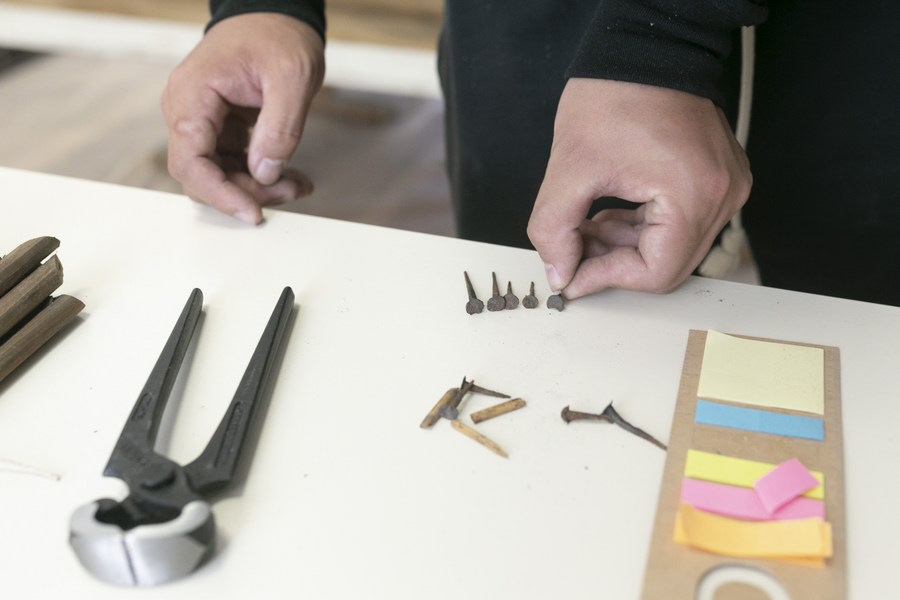 This photo taken on Oct. 16, 2023 shows nails on the wooden gate model of ancient Chinese buildings at the Slovene Ethnographic Museum in Ljubljana, Slovenia. (Photo by Zeljko Stevanic/Xinhua)